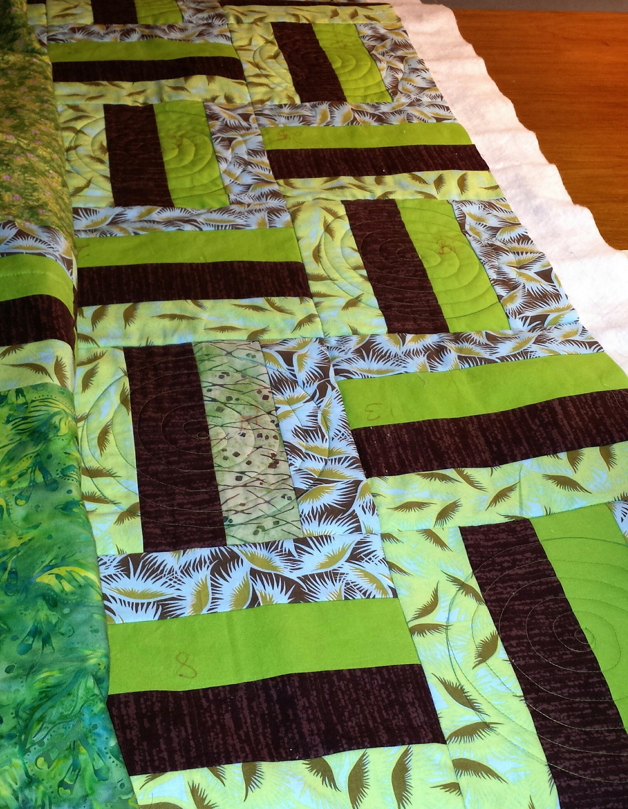 This time I thought I would use the wavy lines, but just down and across the centers of the blocks, and really large. And, after I found my rhythm, I was really pleased with the way I free-motioned these with no marking.