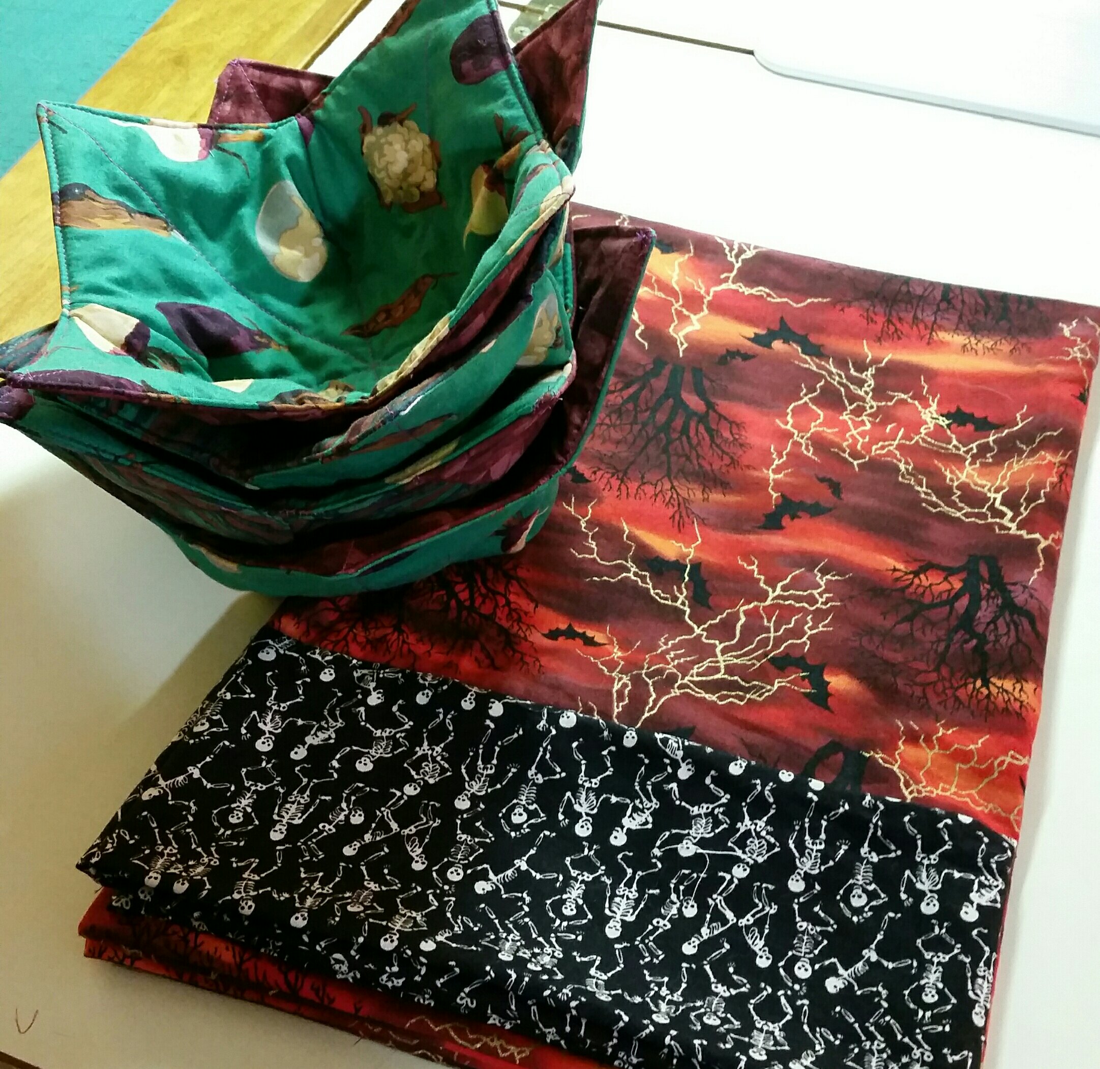 Probably these will be my last finishes of the year. The bowl cozies are for me, and the pillowcase is for donation. I discovered Halloween fabric beneath the Martha Negley fabric I used for the cozies. I don’t know why I have it, but it will be gone after a few more pillowcases. I was glad to find that I’m not the only one with mysterious little piles of fabric hiding around.