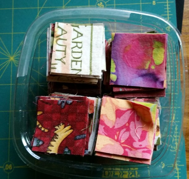 I quilted this with variegated Poly Quilter from Superior. It was the perfect colors, but I have never been able to get it to sew in my machine before (I think it’s 30 wt.). Maybe it was the recent tune-up, but I had little problem this time. The big size 100 needle punched visible holes in the back, but they closed up when I washed it.