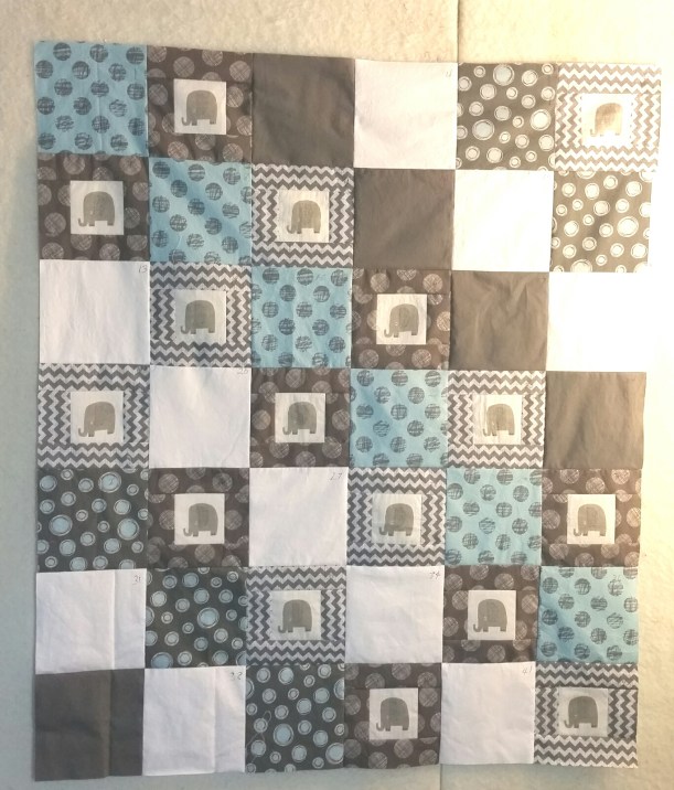 Some of the fabrics were already cut in 6.5″ squares, and I wanted to keep the large prints visible, so I stuck with squares for this one. I found the blue ombre semi-solid that I think adds interest to the alternate squares.