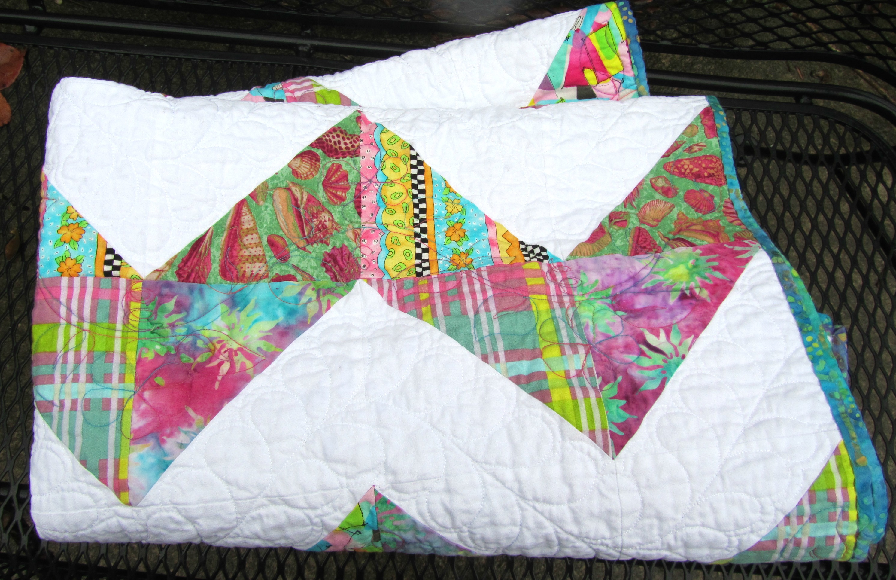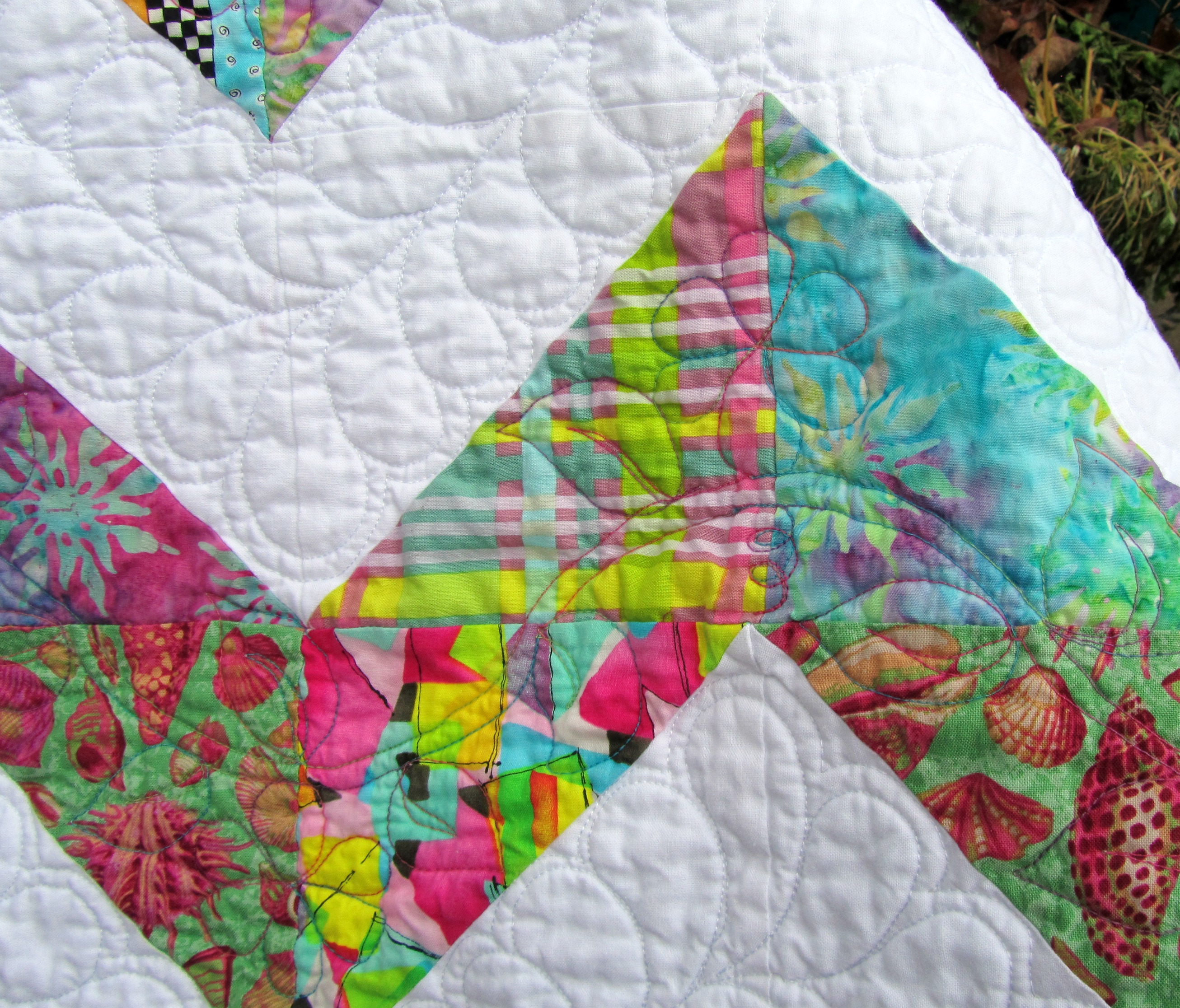 The stash also yielded this perfect piece of batik for the back. Not only is it gorgeous on its own, but it saved the quilt from being too pink. I used the trimmings from the back to bind the quilt, careful to offset the colors so that it contrasts a little with the back.