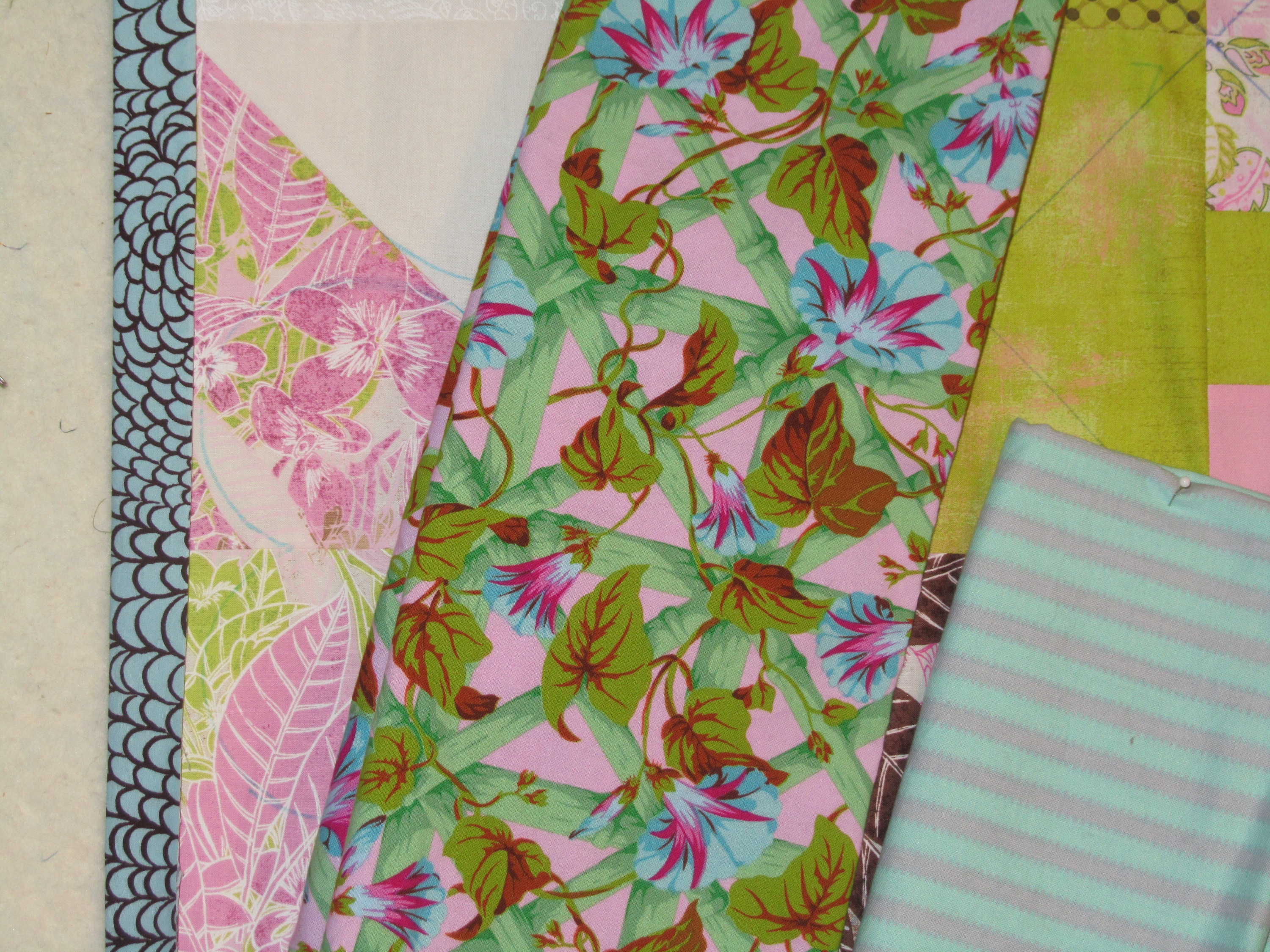 As I’ve pieced these, I’ve not only used my new leaders and enders project, but I’ve webbed the patches, rather than snipping the connecting threads between sections. I’ve heard about this before (Bonnie shows this when assembling blocks in a quilt), but never tried it. Doing the blocks this way kept the patches correctly oriented and saved me a lot of time putting pieces back where they should be. And between the two techniques, I have eliminated the thready mess I usually have going on when piecing!
