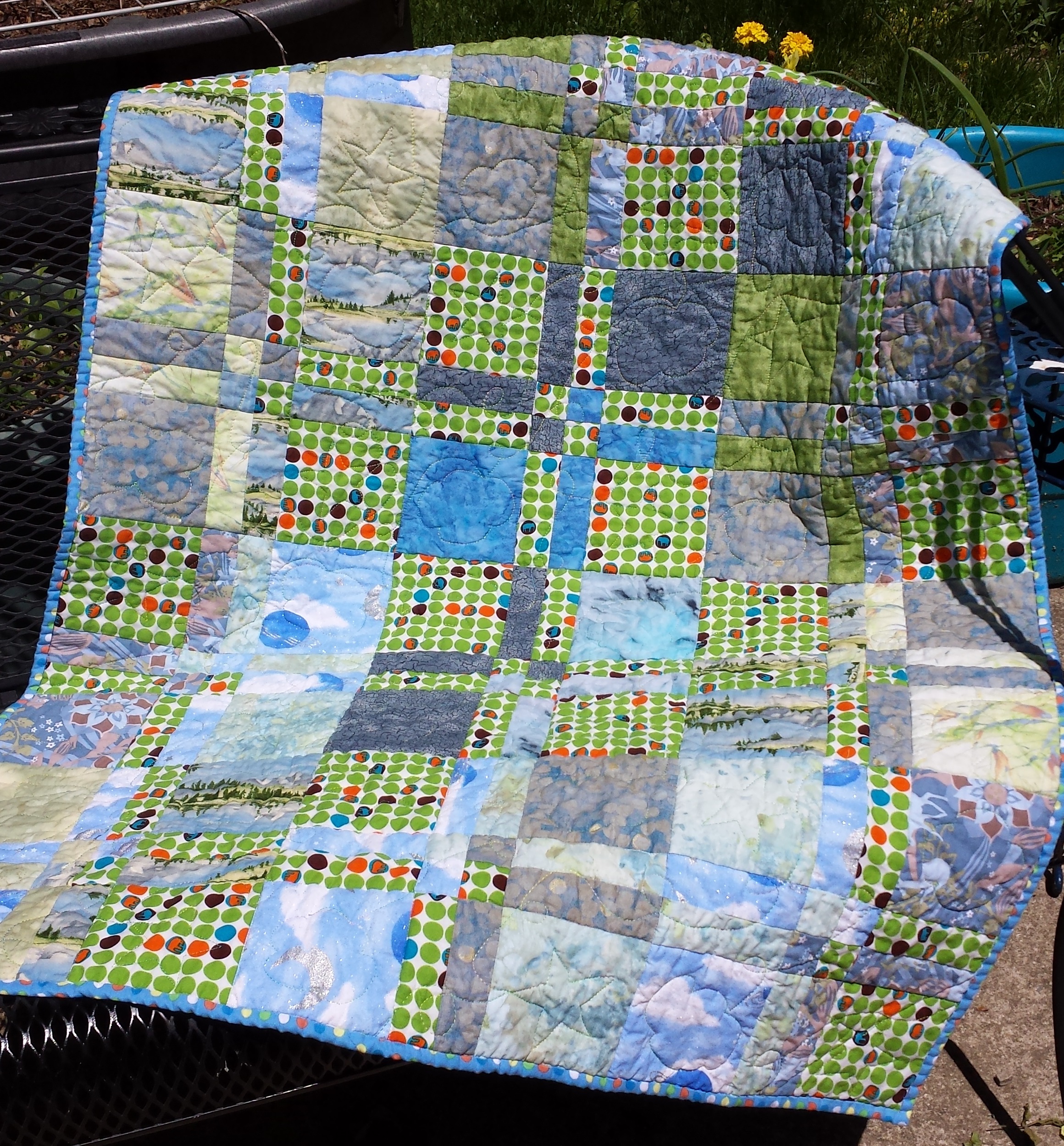 The yardage used was for this baby quilt I made for Project Linus from scraps. I have several quilts set aside to give them, and I thought I’d add one or two before I called my connection. I was also looking for some non-fiddly chain piecing to do, and this filled the bill, at least for the four patch part of the Disappearing Four Patches.