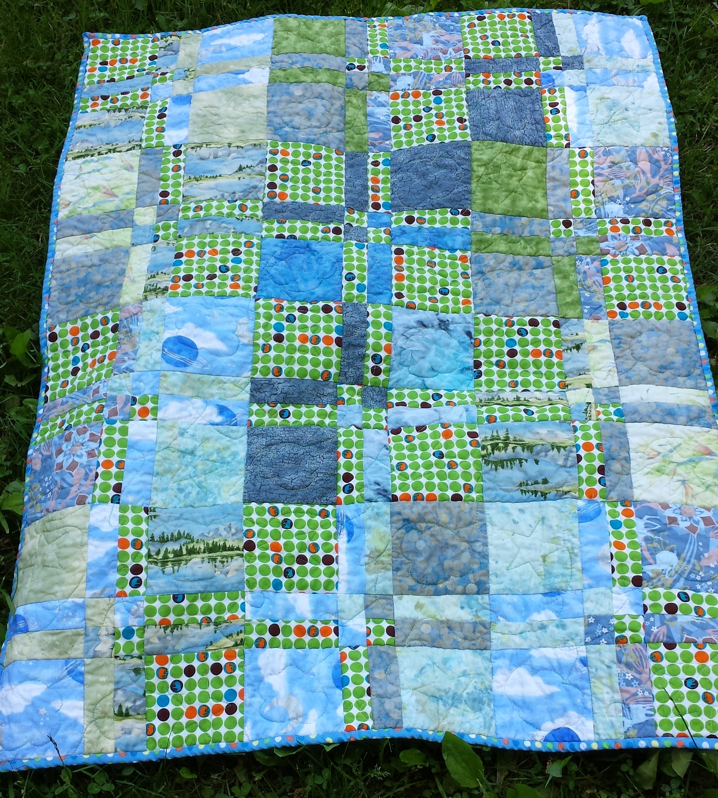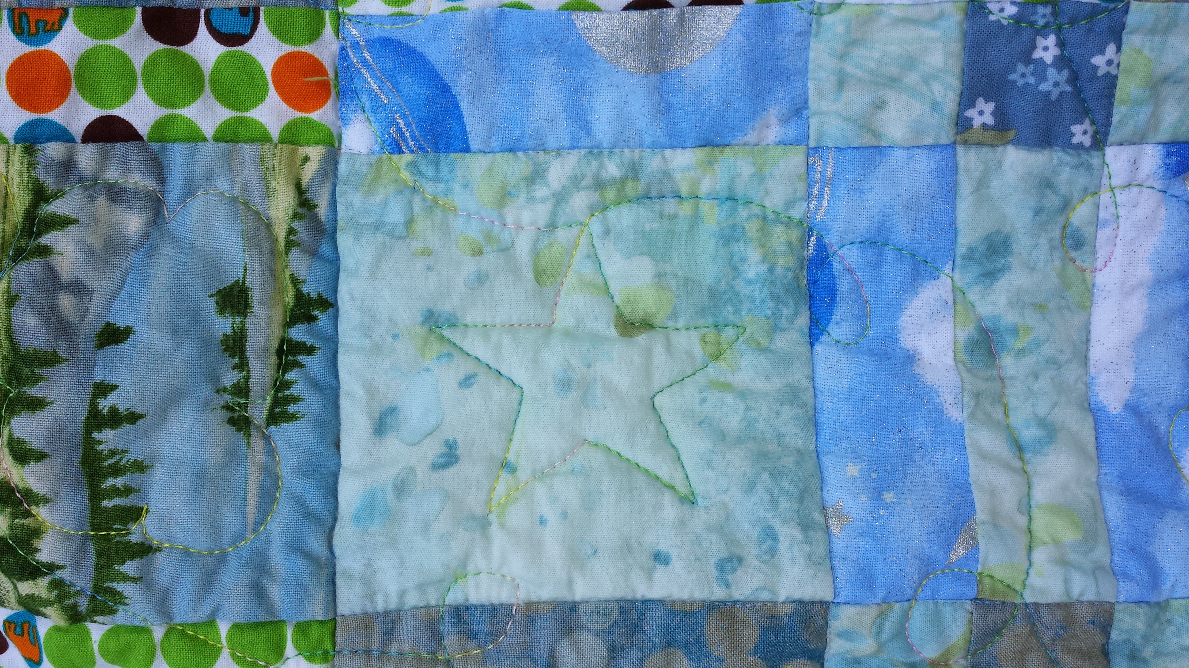 The backing is the cloud and planet fabric. It’s quilted all over with stars, loops, and clouds, using one of Superior’s newish Fantastico variegated threads.