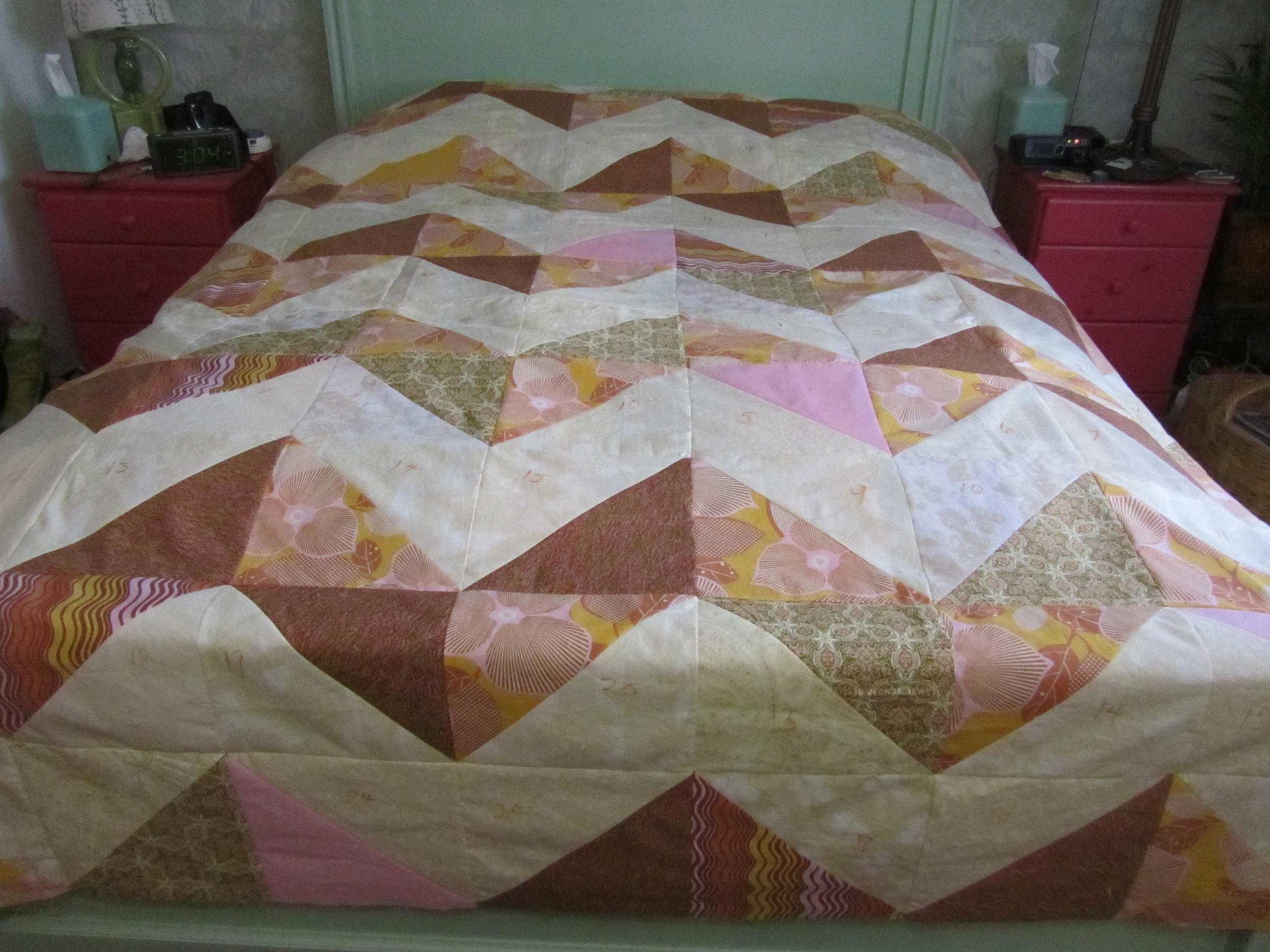 This is “Ocean Breezes”, made in early July. It’s made from 176 HSTs, in a variety of textured fabrics.