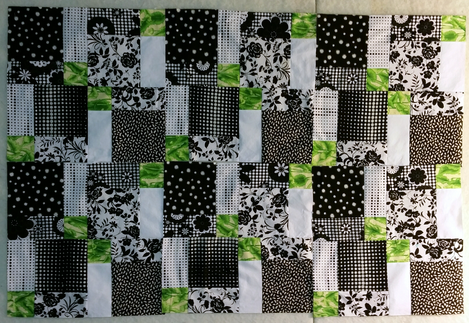 This first quilt measures 52″ x 72″. I quilted all the blocks in the ditch, and stitched the diamond design into the plain blocks. In the border, I quilted 8″ and 4″ Sawtooth Stars, and stippled everything else in the green background. That was a lot of stippling, and I was glad it was finished. The texture is great, but it’s not very original.