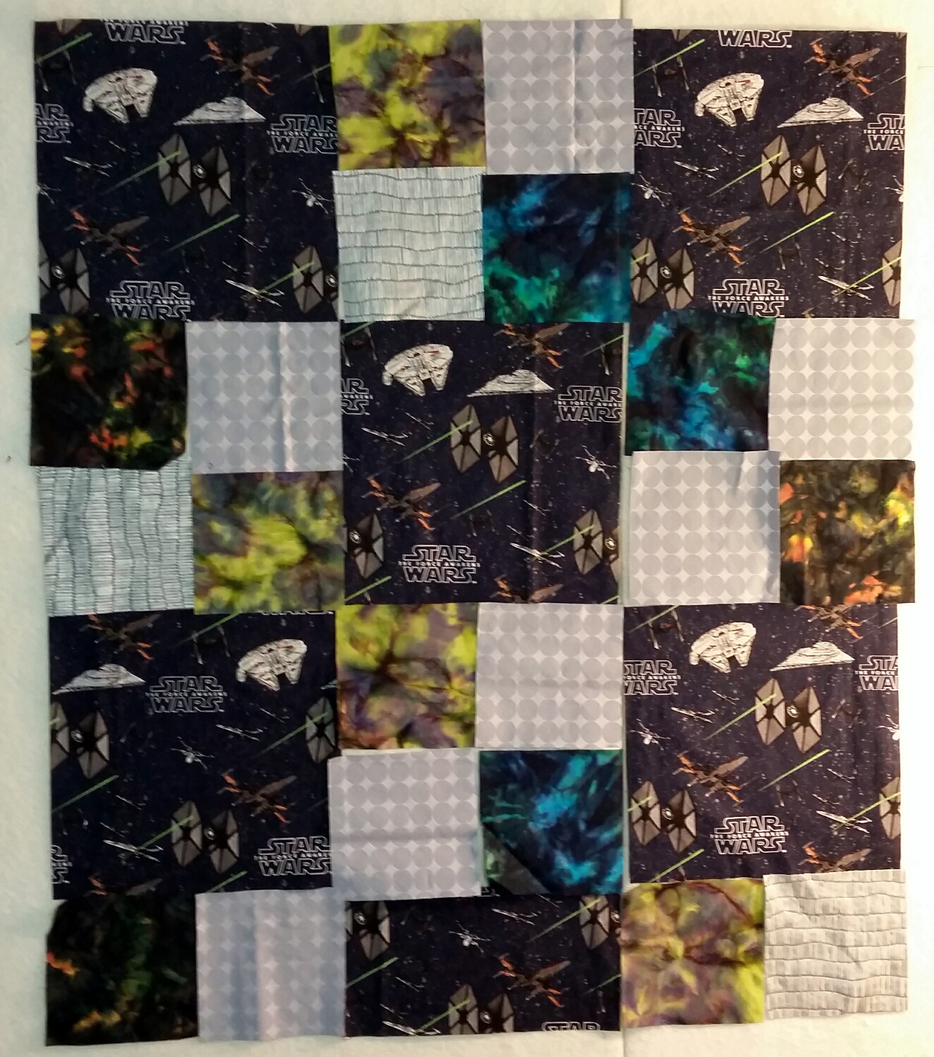 The second version had a few problems. I needed more Kona solid for the borders and to fill in the empty spaces. I like the effect of the extra space in the design. Unfortunately, when the Kona came, it was not the same color as the original. As a sometime knitter, I know all about buying enough of a dye lot for a project, but I hoped that Kaufmann had it down to a science. Also, it seemed a little thinner than the original. The difference doesn’t show much in these outdoor pictures, but under artificial light it’s pretty noticeable. Not awful. I did arrange it carefully, and hope it looks like a design decision.