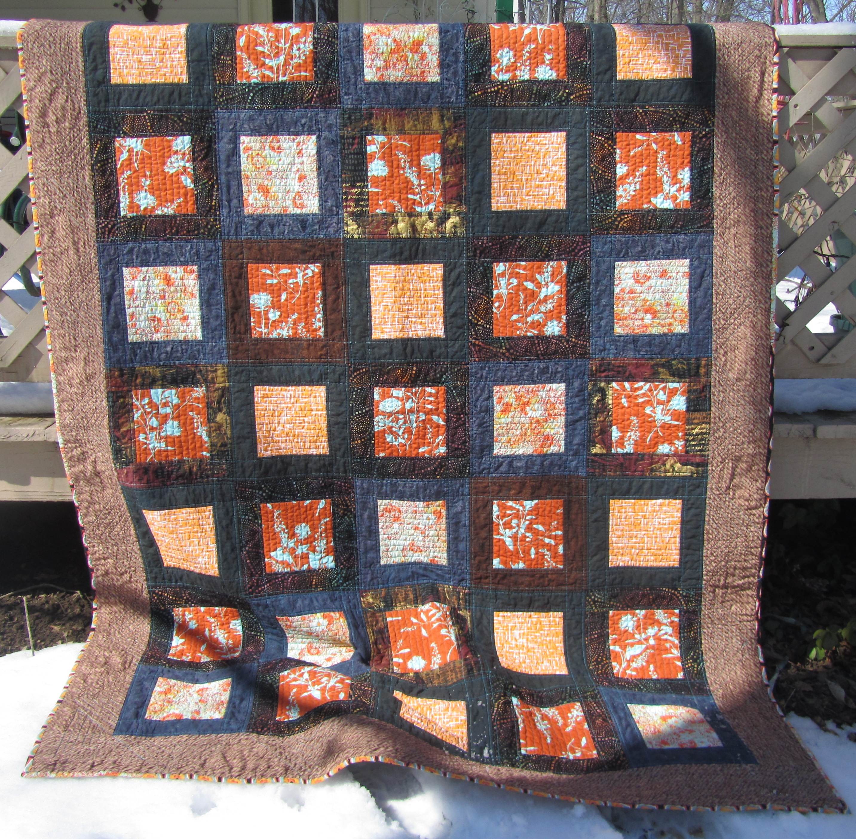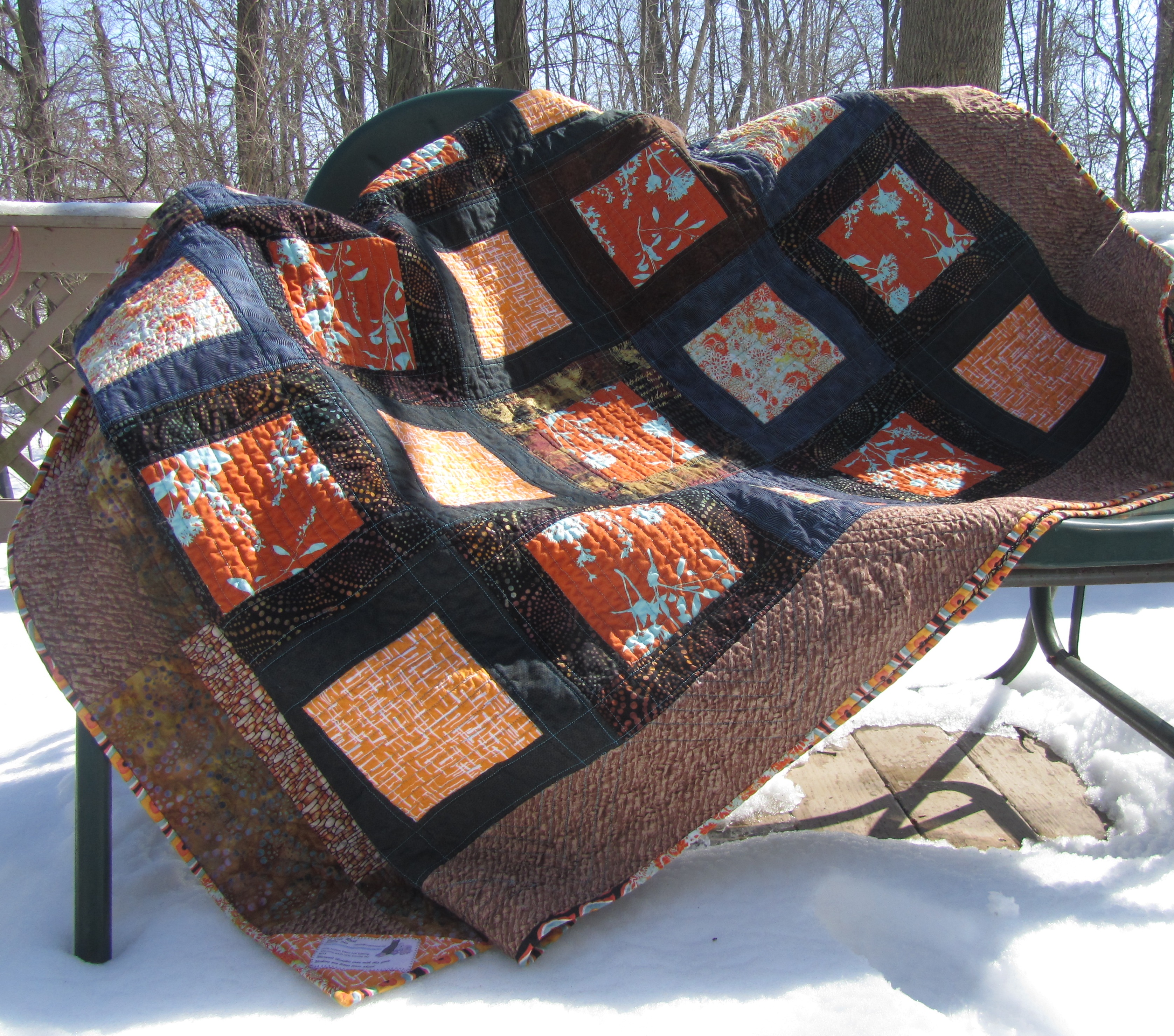 This is one of those quilts that is hard to photograph because of the contrast in the colors, but up close those rich, dark boxes are really very interesting, something someone can look at for a while.