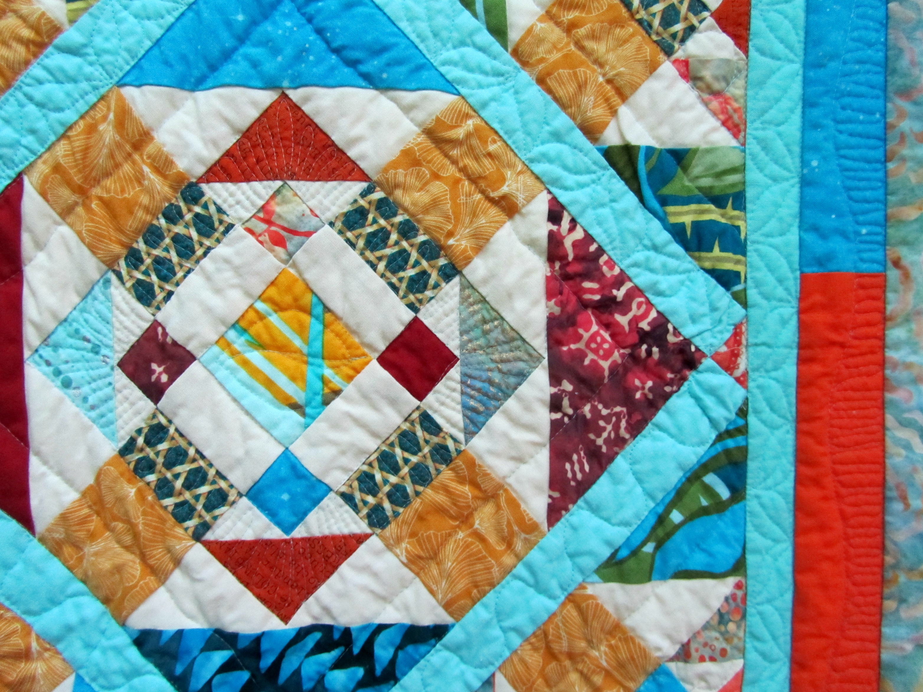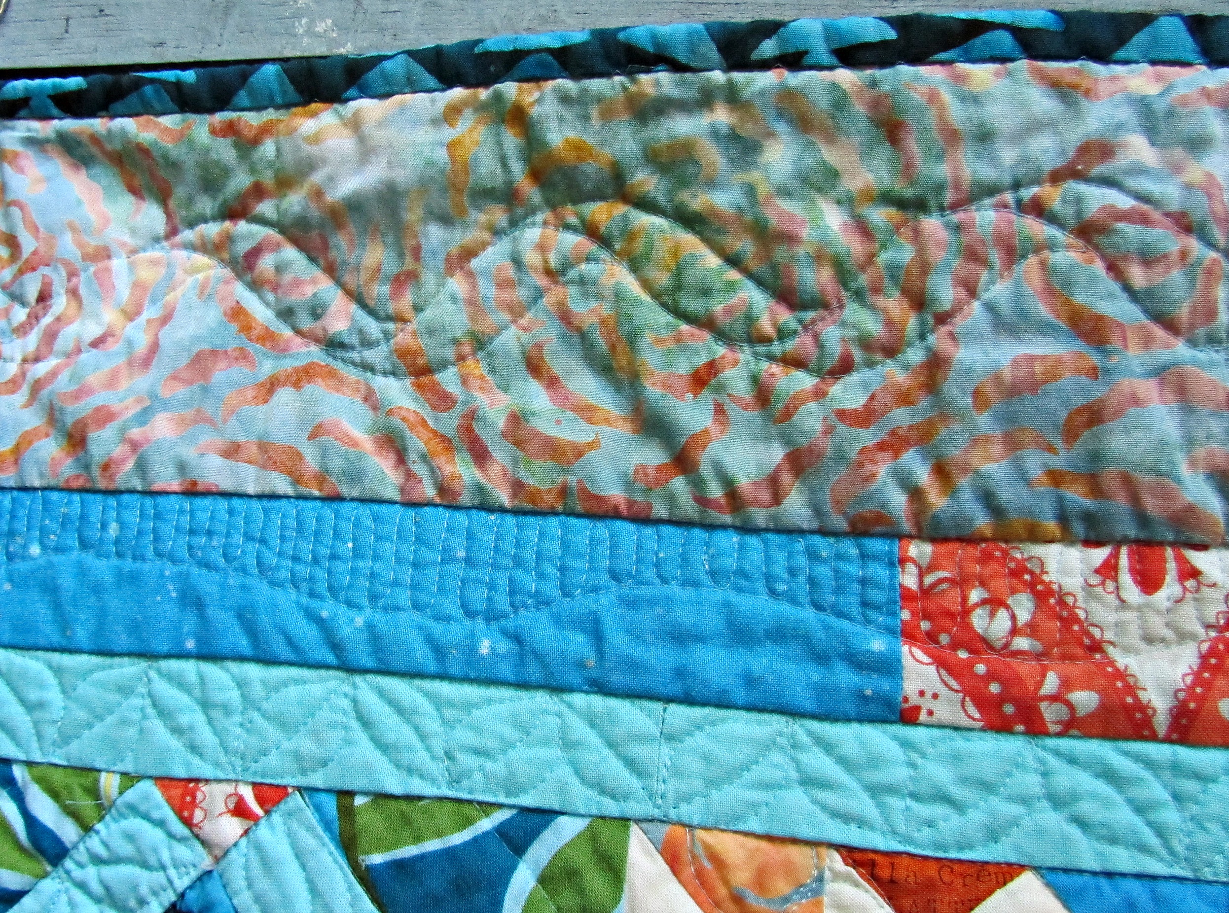 It all washed up pretty flat and straight in the end. Some of the quilting lines look like I was under the influence of something, but that’s what happens when you quilt over bumpy ground. All in all, it’s very successful. I love the colors I used. I’m keeping this one, at least for a while.