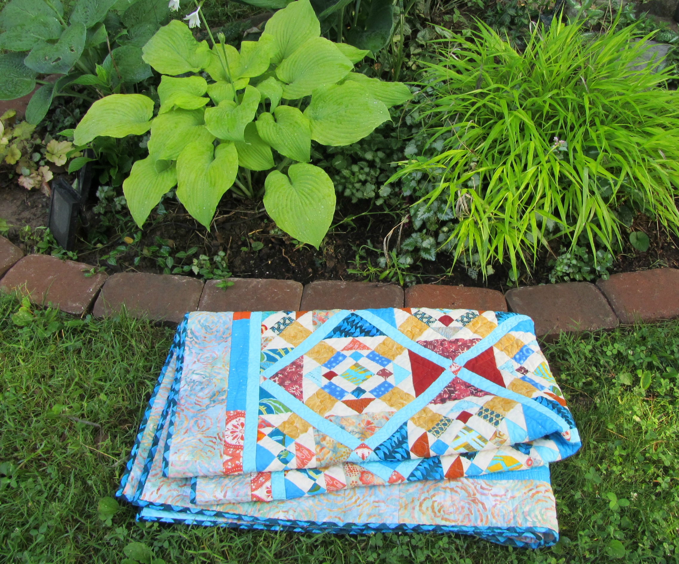 Yes, It’s finally finished! I’ve only had the top finished since the end of May, so I suppose two solid weeks of quilting isn’t ridiculous, but it seems like forever. Maybe because we #twilters and others started this mystery quilt late last fall as we gathered and cut our scraps. Maybe because we pieced along all winter and early spring as the design was revealed. Maybe because by the time I assembled it, the blocks weren’t exactly, um, flat. But now it’s done, and very pretty!