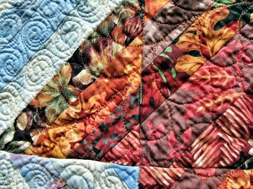 I quilted straight diagonal lines in brown Bottom Line through the dark areas, and used yellow Sulky for feathers through the lighter areas.